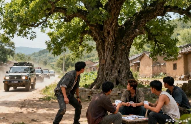 村口有棵老槐树,树下坐着几个混混模样的年轻人在打牌。看到陌生的车队,他们都站了起来。