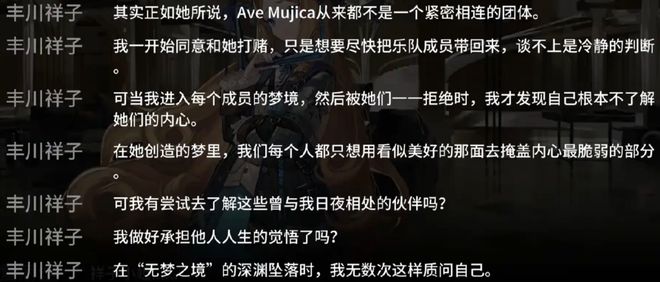 经历过各种梗图以及八面漏风的保密洗礼过后,鹰角终于把各路玩家鸡粉乐子人“期待”良久的《BanG Dream!Ave Mujica》联动版本「无忧梦呓」端了上来,各个二游群顿时像看到孔乙己来到小酒馆,充满了欢快的气息。有上来就检测丰川祥子DPS的,有吐槽祥子恶魔角主人这一块的,认真过剧情看到搞笑巧思马上转来群里的,甚至还有讨论大祥脚的......emmmm,合乎粥礼了说是。