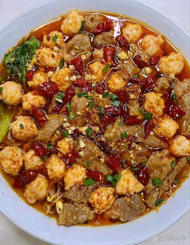 4.依次放入黄豆芽、千张、生菜和金针菇,煮熟后捞出来铺在大碗里,再放入虾滑和牛肉卷煮熟,煮好后全部铺在大5.碗里,撒入蒜末、干红辣椒、花椒、辣椒面、熟白芝麻、葱花,泼入热油即可。