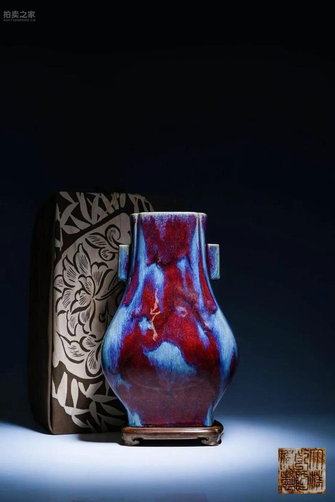 1120 号 清乾隆窑变釉四方倭角杏园贯耳方壶,造型仿商周青铜尊彝,窑变釉色惊艳 —— 红似凝血、蓝若碧海,交融如彩霞。另配旧木盒,墨书 “乾隆宫窑辰砂贯耳花瓶”,完好大器存世寥寥。
